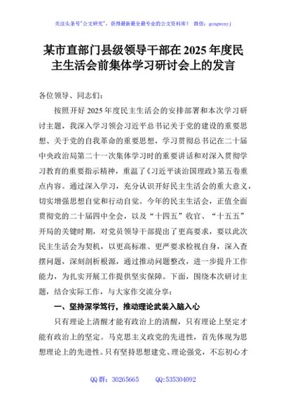 / 某市直部门县级领导干部在2025年度民主生活会前集体学习研讨会上的发言