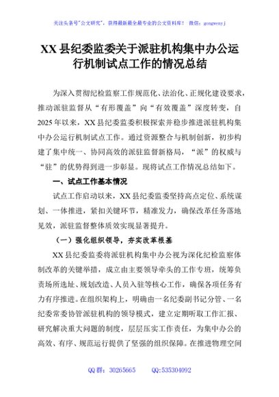 / XX县纪委监委关于派驻机构集中办公运行机制试点工作的情况总结