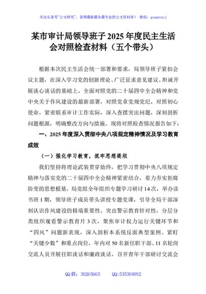 / 某市审计局领导班子2025年度民主生活会对照检查材料(五个带头)