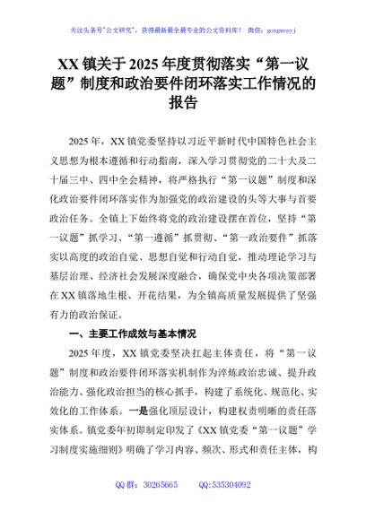 / XX镇关于2025年度贯彻落实“第一议题”制度和政治要件闭环落实工作情况的报告