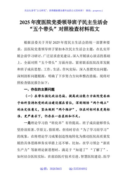 / 2025年度医院党委领导班子民主生活会“五个带头”对照检查材料范文