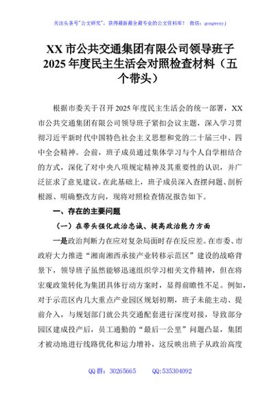 / XX市公共交通集团有限公司领导班子2025年度民主生活会对照检查材料(五个带头)