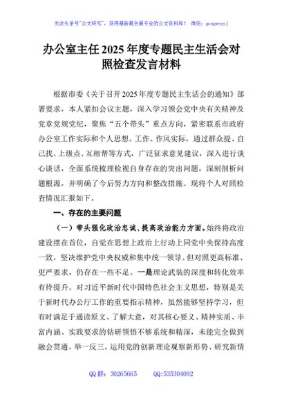 / 办公室主任2025年度专题民主生活会对照检查发言材料