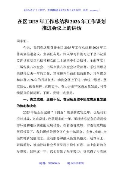 / 在区2025年工作总结和2026年工作谋划推进会议上的讲话
