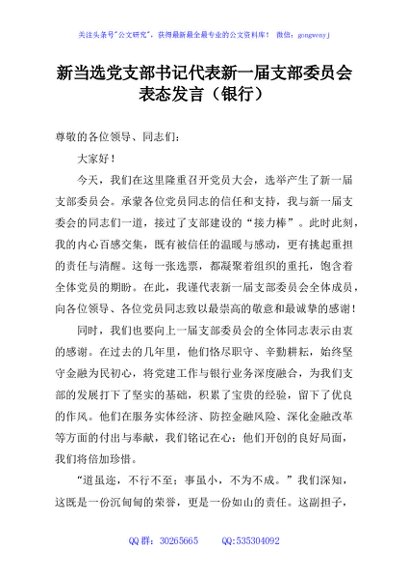 / 新当选党支部书记代表新一届支部委员会表态发言(银行)