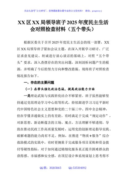 / XX区XX局领导班子2025年度民主生活会对照检查材料(五个带头)