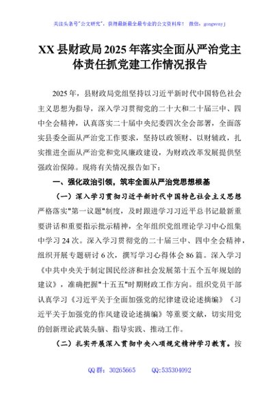 / XX县财政局2025年落实全面从严治党主体责任抓党建工作情况报告