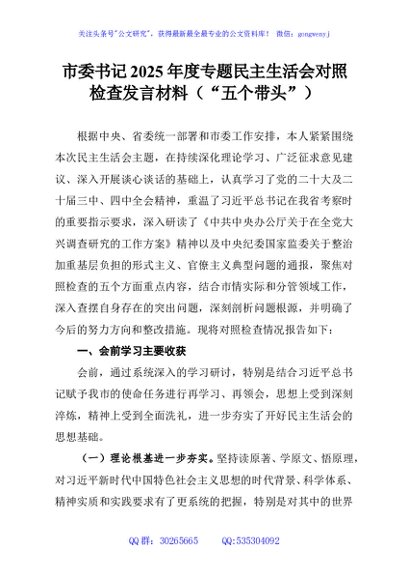 / 市委书记2025年度专题民主生活会对照检查发言材料(“五个带头”)