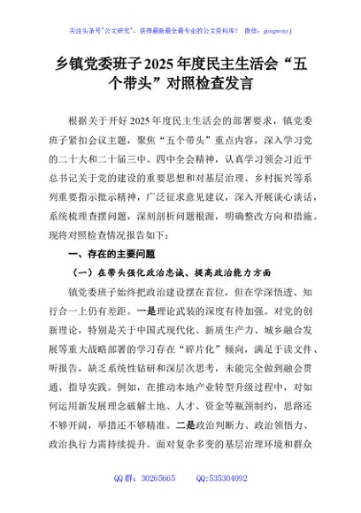 / 乡镇党委班子2025年度民主生活会“五个带头”对照检查发言