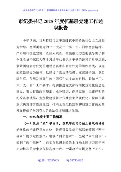 / 市纪委书记2025年度抓基层党建工作述职报告