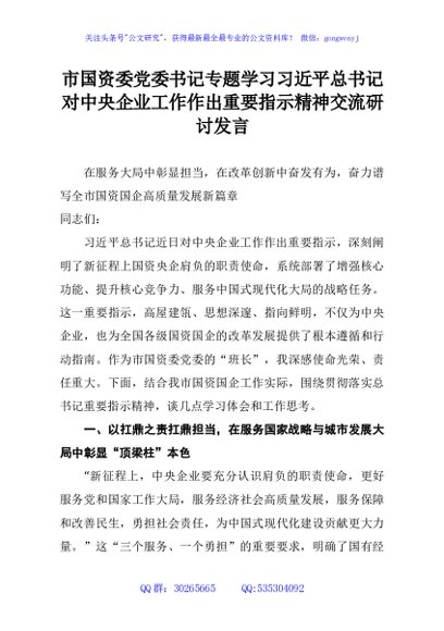 / 市国资委党委书记专题学习习近平总书记对中央企业工作作出重要指示精神交流研讨发言