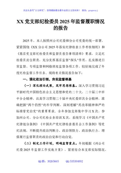 / XX党支部纪检委员2025年监督履职情况的报告