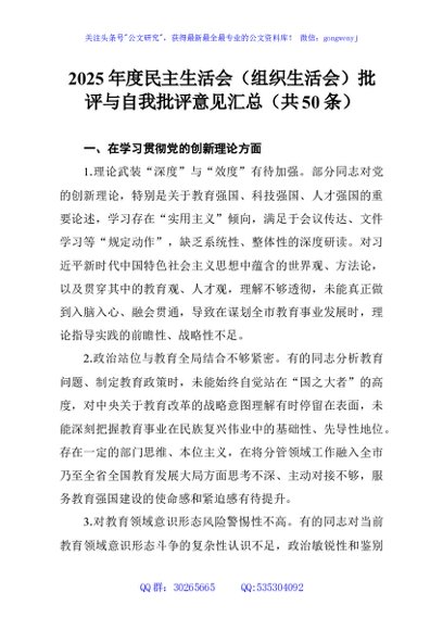 / 2025年度民主生活会(组织生活会)批评与自我批评意见汇总(共50条)