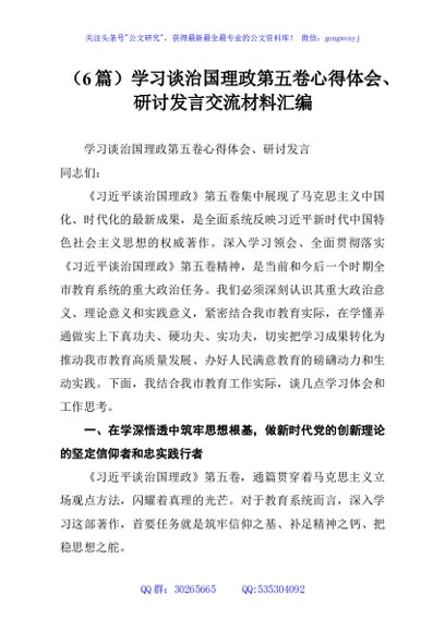 (6篇)学习谈治国理政第五卷心得体会、研讨发言交流材料汇编