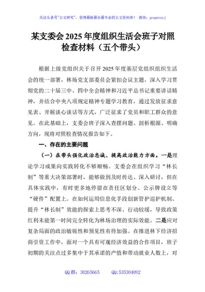 / 某支委会2025年度组织生活会班子对照检查材料(五个带头)