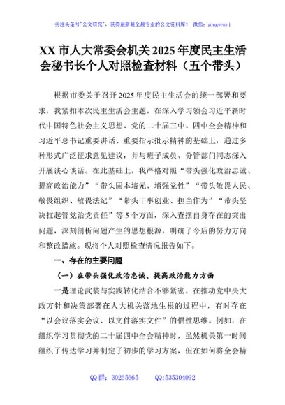 / XX市人大常委会机关2025年度民主生活会秘书长个人对照检查材料(五个带头)