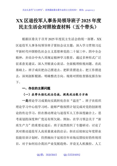 / XX区退役军人事务局领导班子2025年度民主生活会对照检查材料(五个带头)