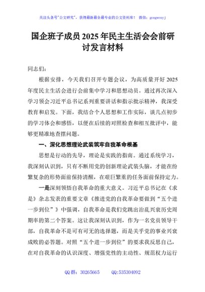 / 国企班子成员2025年民主生活会会前研讨发言材料