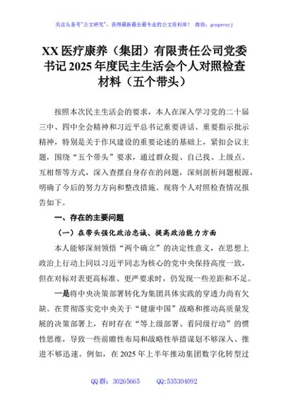 / XX医疗康养(集团)有限责任公司党委书记2025年度民主生活会个人对照检查材料(五个带头)