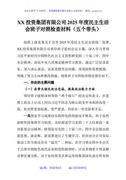 / XX投资集团有限公司2025年度民主生活会班子对照检查材料(五个带头)