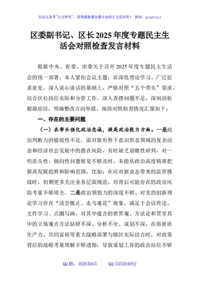 / 区委副书记、区长2025年度专题民主生活会对照检查发言材料