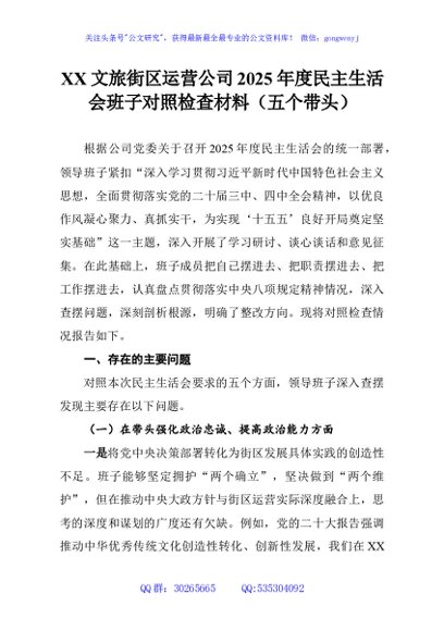/ XX文旅街区运营公司2025年度民主生活会班子对照检查材料(五个带头)