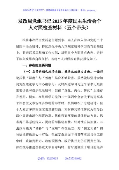 / 发改局党组书记2025年度民主生活会个人对照检查材料(五个带头)
