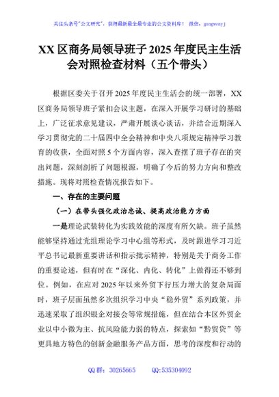 / XX区商务局领导班子2025年度民主生活会对照检查材料(五个带头)