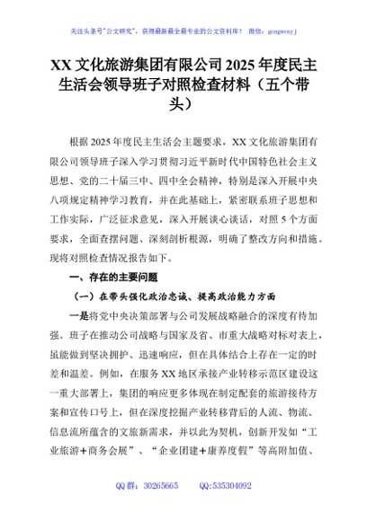 / XX文化旅游集团有限公司2025年度民主生活会领导班子对照检查材料(五个带头)