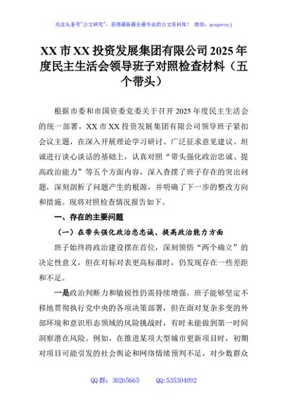 / XX市XX投资发展集团有限公司2025年度民主生活会领导班子对照检查材料(五个带头)