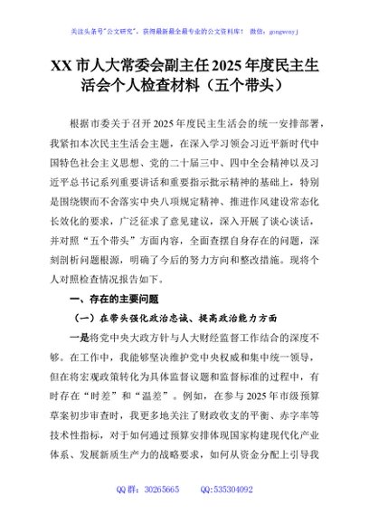 / XX市人大常委会副主任2025年度民主生活会个人检查材料(五个带头)