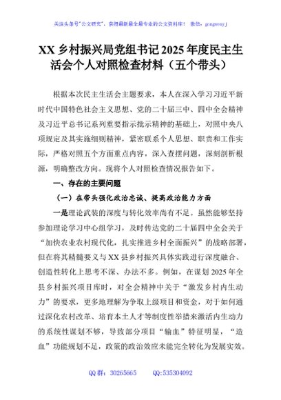 / XX乡村振兴局党组书记2025年度民主生活会个人对照检查材料(五个带头)