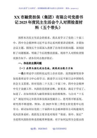 / XX市融资担保(集团)有限公司党委书记2025年度民主生活会个人对照检查材料(五个带头)