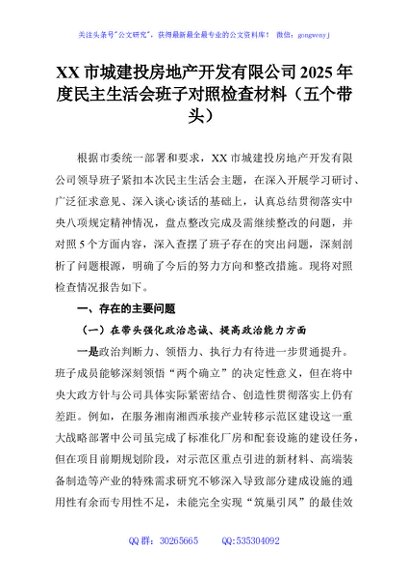 / XX市城建投房地产开发有限公司2025年度民主生活会班子对照检查材料(五个带头)