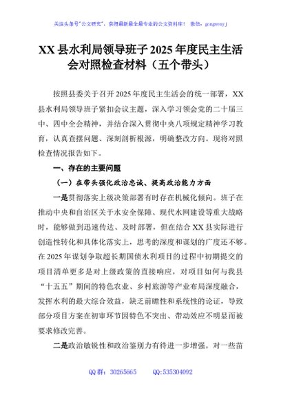/ XX县水利局领导班子2025年度民主生活会对照检查材料(五个带头)