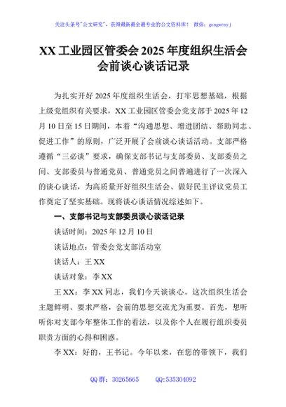 / XX工业园区管委会2025年度组织生活会会前谈心谈话记录