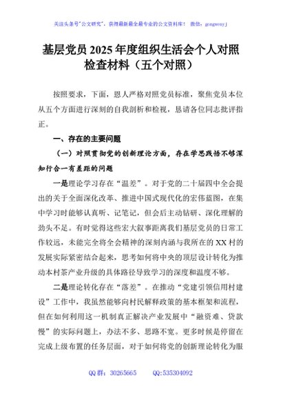 / 基层党员2025年度组织生活会个人对照检查材料(五个对照)