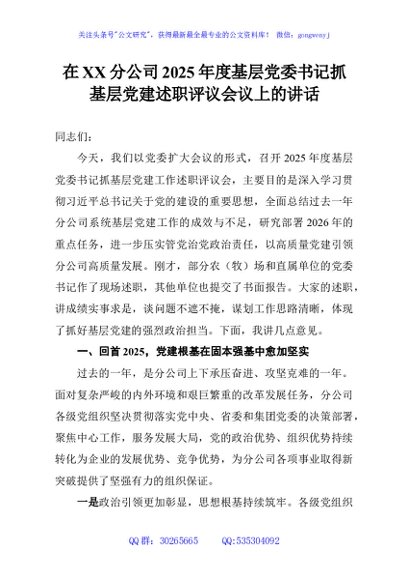 / 在XX分公司2025年度基层党委书记抓基层党建述职评议会议上的讲话