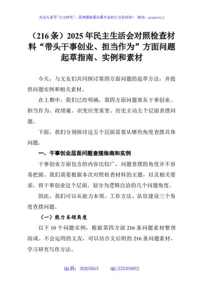 / (216条)2025年民主生活会对照检查材料“带头干事创业、担当作为”方面问题起草指南、实例和素材