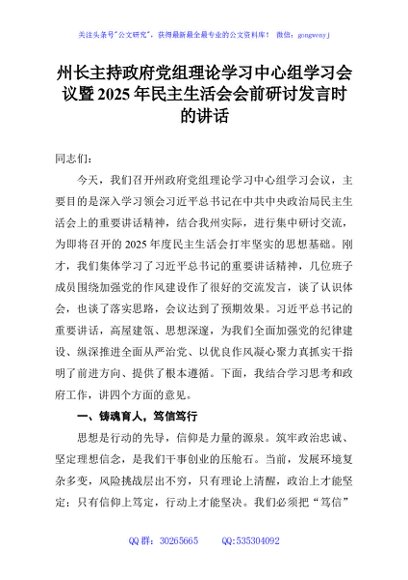 / 州长主持政府党组理论学习中心组学习会议暨2025年民主生活会会前研讨发言时的讲话