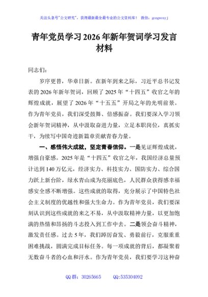 / 青年党员学习2026年新年贺词学习发言材料