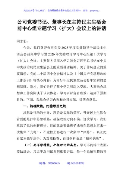 / 公司党委书记、董事长在主持民主生活会前中心组专题学习(扩大)会议上的讲话