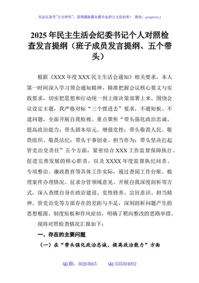 / 2025年民主生活会纪委书记个人对照检查发言提纲(班子成员发言提纲、五个带头)