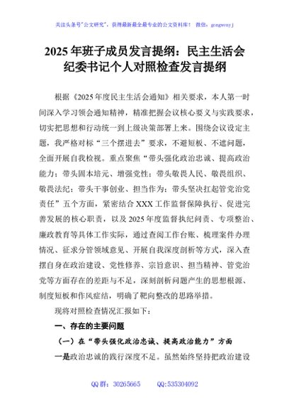 / 2025年班子成员发言提纲:民主生活会纪委书记个人对照检查发言提纲