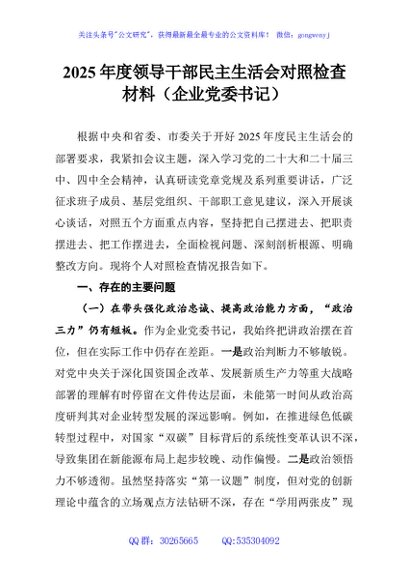 / 2025年度领导干部民主生活会对照检查材料(企业党委书记)