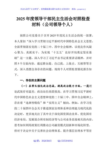 / 2025年度领导干部民主生活会对照检查材料(公司领导个人)