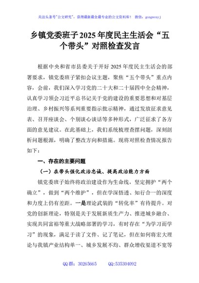 / 乡镇党委班子2025年度民主生活会“五个带头”对照检查发言