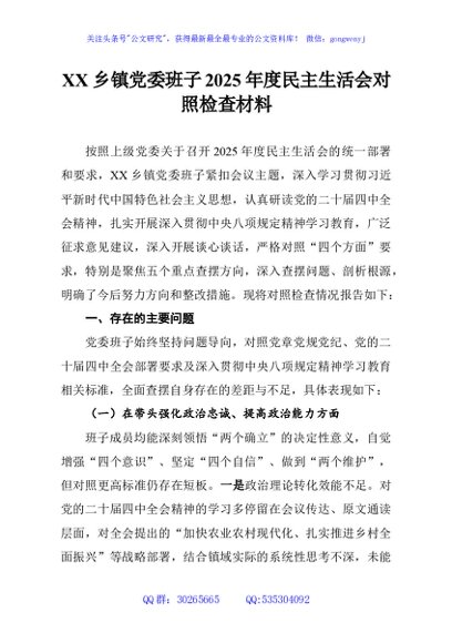 / XX乡镇党委班子2025年度民主生活会对照检查材料