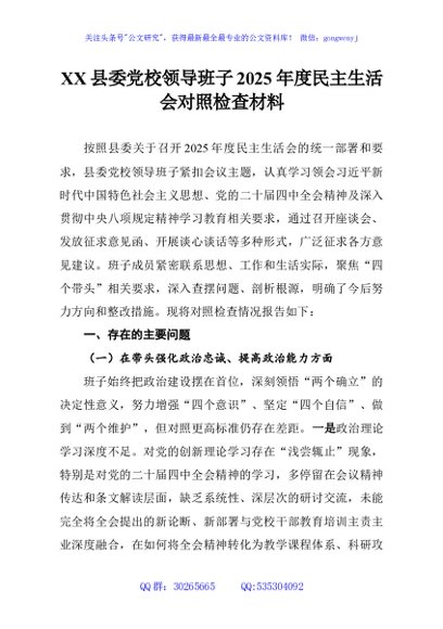 / XX县委党校领导班子2025年度民主生活会对照检查材料