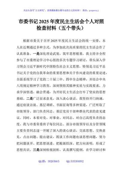 / 市委书记2025年度民主生活会个人对照检查材料(五个带头)